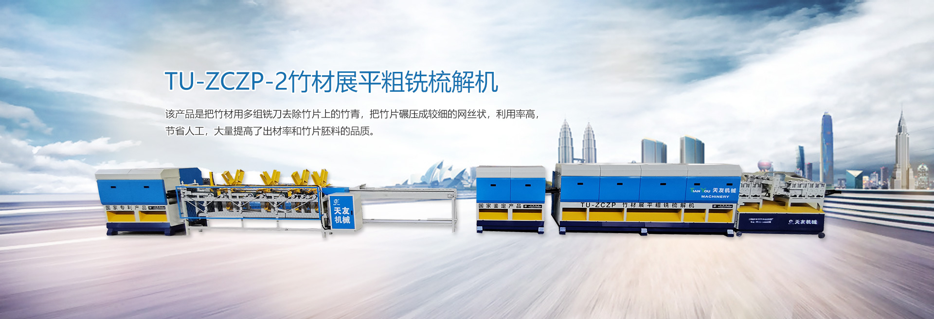 本廠生產的“天友”牌竹木兩大系列機械產品,品種齊全,包括(竹木機械、重竹設備、竹筷成套機械、牙簽成套機械、刨篾機、包裝機、竹地板成套設備、竹涼席成套設備、砂光機、破竹機、拉絲機、精刨機、帶節(jié)雙生筷、天削筷機械等) ,結構新穎,質量上乘,以完善的售后服務體系深受客戶的好評。